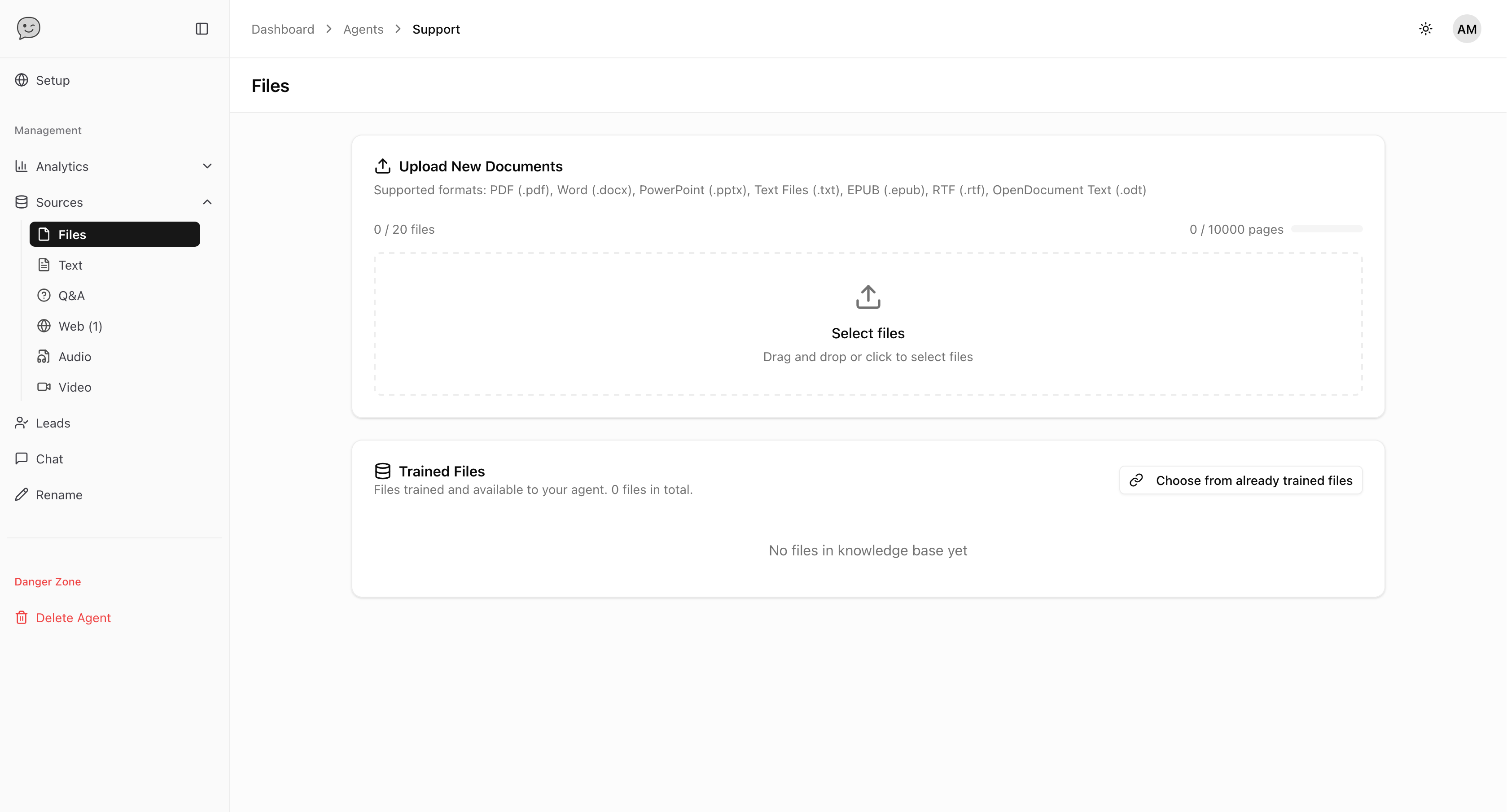 Upload documents, add website content, or connect your data sources to train your AI chatbot with your business data