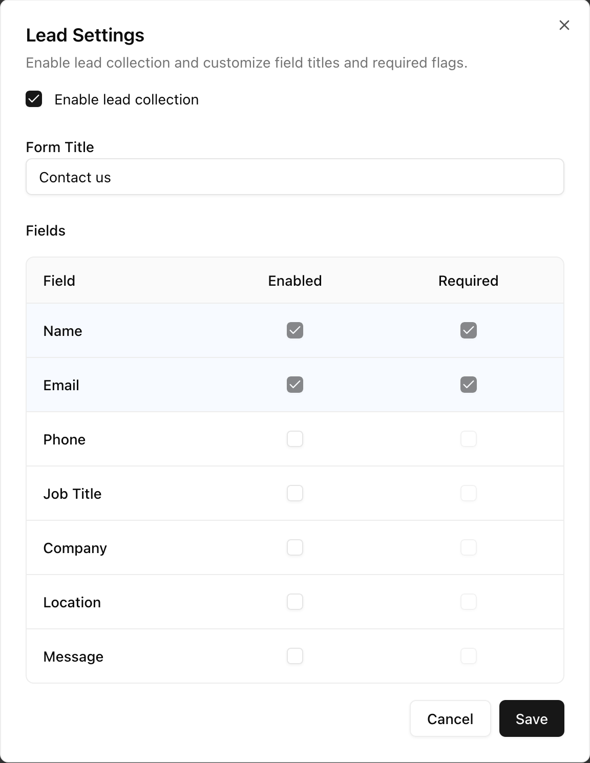 Here, you can enable or disable lead generation, choose which fields you want to collect, and give the form a custom title.