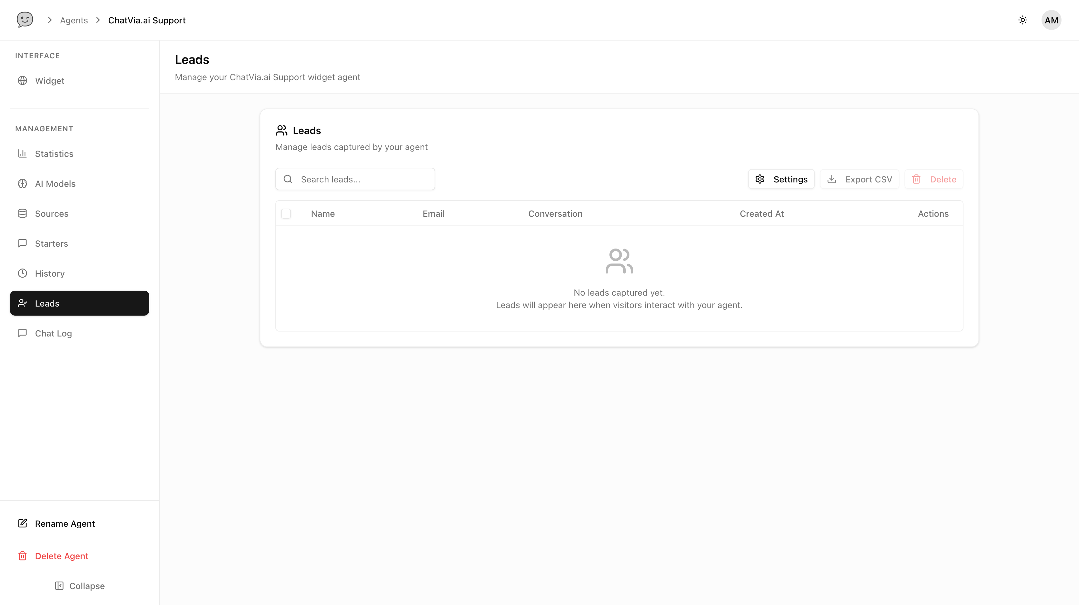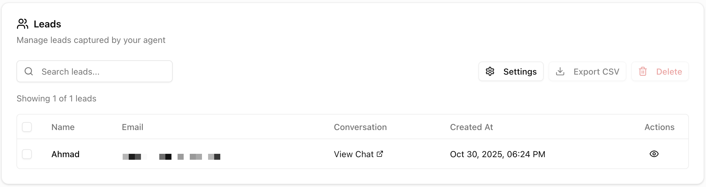 Any leads collected by the agent will appear on this page. If you’d like to customize how leads are collected, click Settings.
